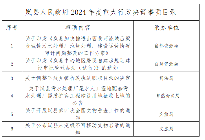 | 标 题 | 岚县人民政府2024年度重大行政决策事项目录 | ||
