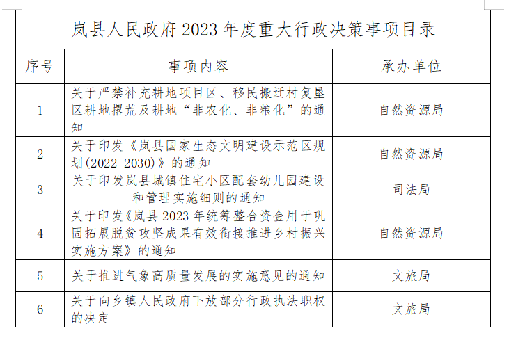 | 标 题 | 岚县人民政府2023年度重大行政决策事项目录 | ||